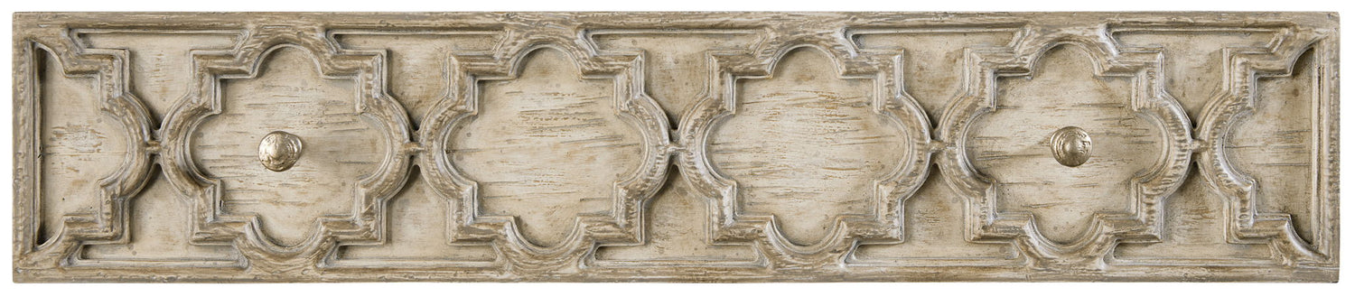 In a European provincial silhouette with a Moroccan flair, the Bellissimo Bachelors Chest is adorned with geometric motifs on the front, and a two-tone finish treatment. Pottery, or dark gray, is on the outside of the case, and Light Tusk, or light taupe, is on the drawer fronts. A touch of elegance is added with hand-hammered Florentine gold knob hardware. The three drawers have self-closing undermount drawer guides. In the top drawer is a drop-in felt liner and the bottom drawer is cedar lined. Three-plug electrical outlet.