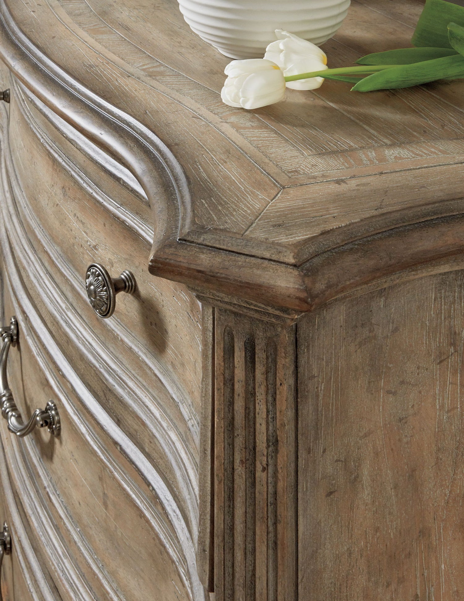 The Castella Bachelors Chest brings together classic style elements and a refined, rustic finish with the look of natural wood bathed in sunshine. Exuberant design motifs such as an acanthus leaf molding around the base, column motifs on the case and ornate bun feet infuse the piece with emotion. The Antique Slate finish in a beautiful patina, accented by knob-and-bail pull hardware in an antique silver finish, exudes a livable resort feeling for your interiors. Three drawers, including a cedar-lined bottom drawer and a removable felt liner for the top drawer. On the back is a convenient 3-plug outlet with USB port.