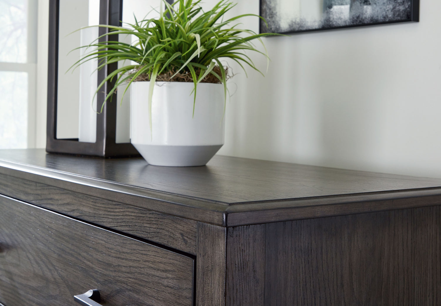 - Medium gray-brown finish with a blackened wood grain contrast; embossed wood grain texture