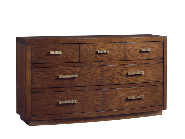 • This Seven Drawer Dresser Offers A Soft Convex Front Finished In A Warm Mocha Finish With Soft Gray Undertones And Is Elegantly Complemented By Custom Designed Drawer Pulls In A Lightly Burnished Silver Coloration