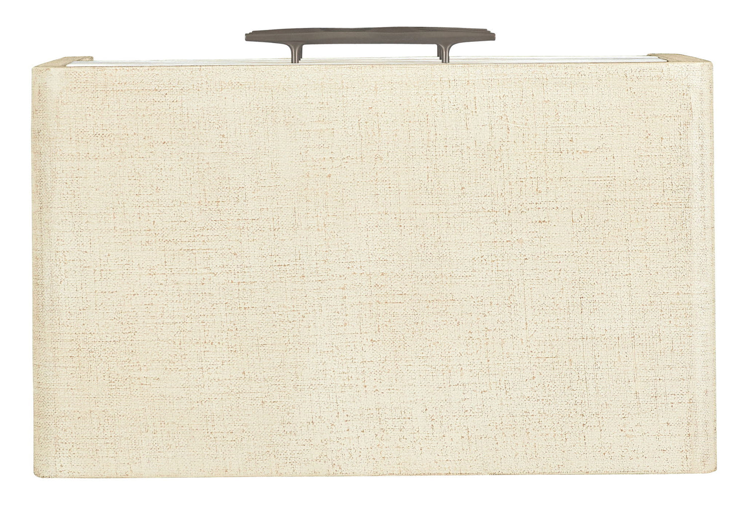 The sleek and modern Cascade 3-drawer nightstand combines the Pebble Beach lacquered burlap finish on the outside of the case with a cast resin soft white Chalk finish on the drawer fronts, accented by champagne-colored bar-pull hardware. Three self-closing drawers and a USB port and cord clip are featured.