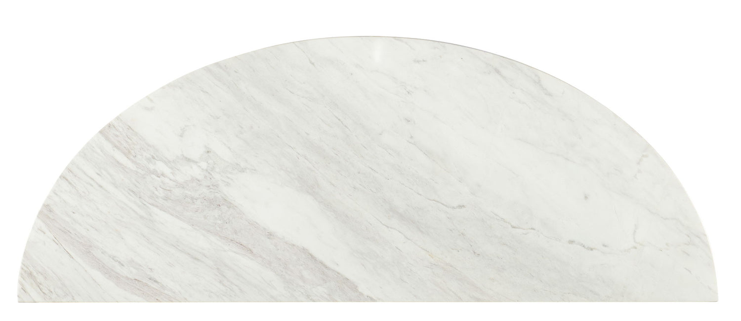 Architectural and timeless with a luxe mixture of materials, the Modern Mood Nightstand is a statement piece. Featuring a demilune shape and two self-closing drawers, the nightstand has a metal frame, legs and slender pulls and a white and gray marble top. The case is crafted of Oak Veneers and finished in the dark Mink color with wire-brush detailing.