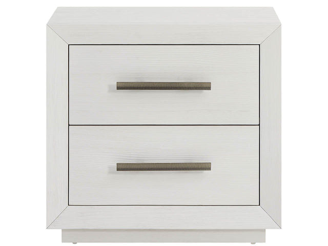 The Shoreline Nightstand is crafted from sand-blasted pine in a crisp Shoreline finish, featuring two drawers with modern bar pulls in brushed nickel. This nightstand provides ample bedside storage and convenience with built-in electrical outlets including USB and USB-C connections.