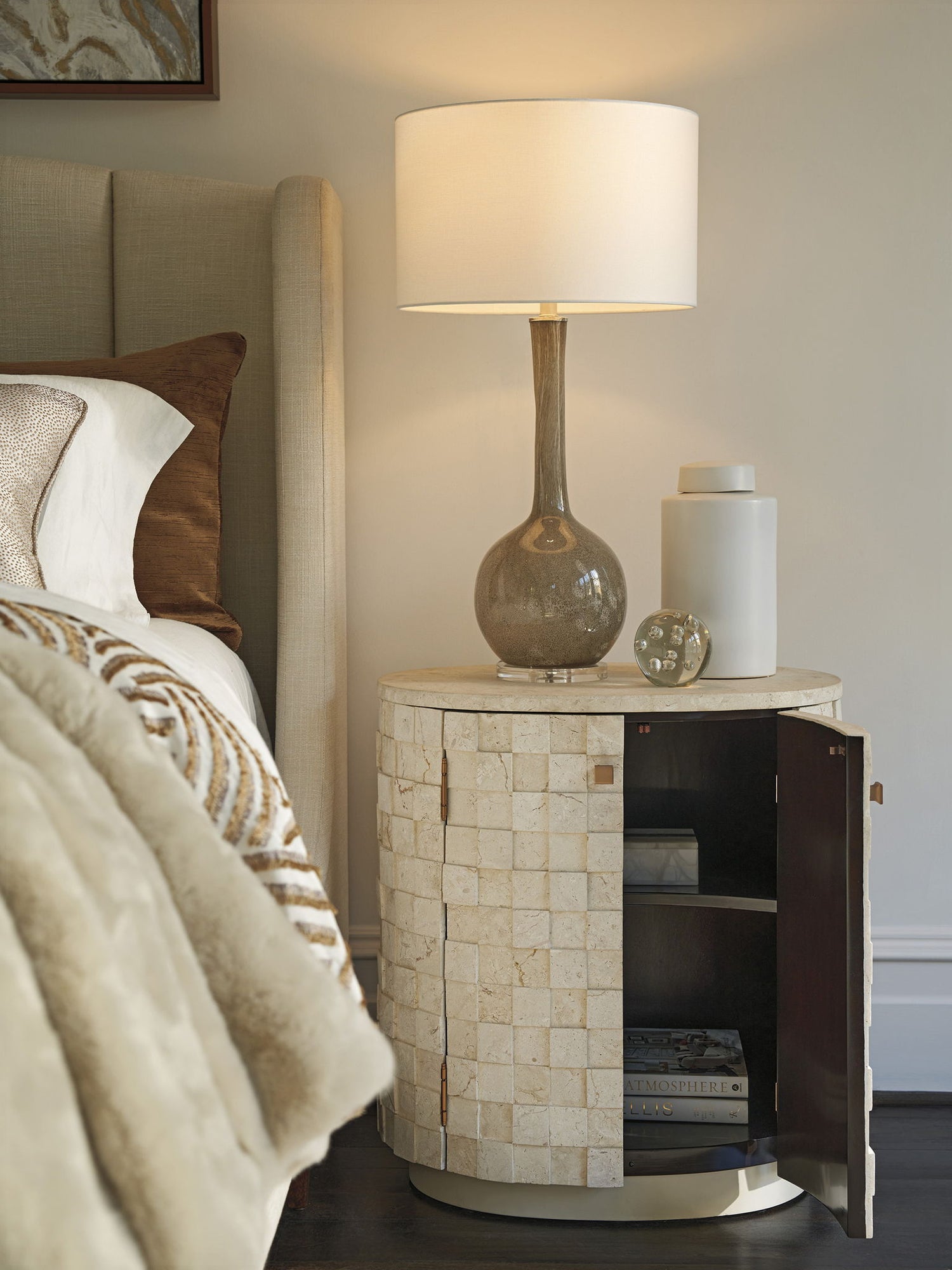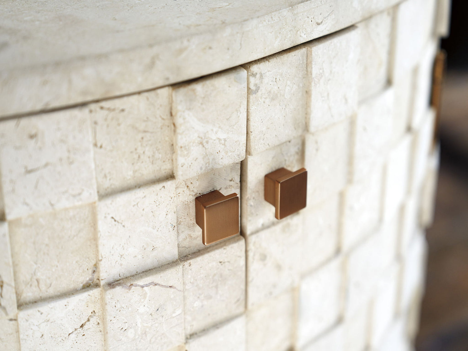 - The Albion Oval Nightstand Features Dimensional Limestone Squares Around The Perimeter, A Veneered Limestone Top, And A Recessed Wooden Plinth Base