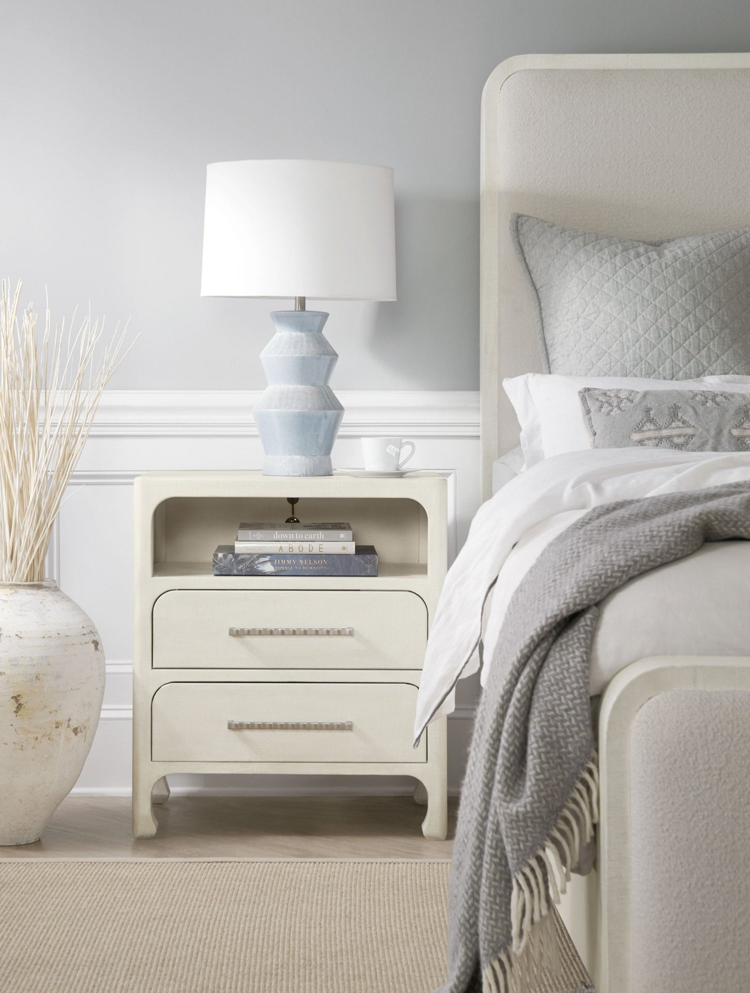 Inspired by casual waterfront living with a chic sophistication, the Serenity Nightstand is crafted of Wood and Raffia and finished in Sand Dollar, a white lacquered grasscloth. Chow-style legs and light champagne-colored decorative bar pulls add a designer touch. The two drawers have soft-close drawer guides, and there’s one open area above the drawers. There’s a USB charger with two ports and a cord clip on the back.