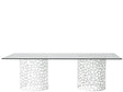 The Coral Dining Table features a rectangular glass top supported by two coral-inspired cast aluminum bases in a clean white finish. This dining table's transparent top enhances the sculptural base creating a statement piece that embodies coastal elegance.