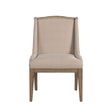 The Buxton parsons chair features wrap around arm styling in an oatmeal color textured fabric with wooden legs and accents in a weathered natural finish.