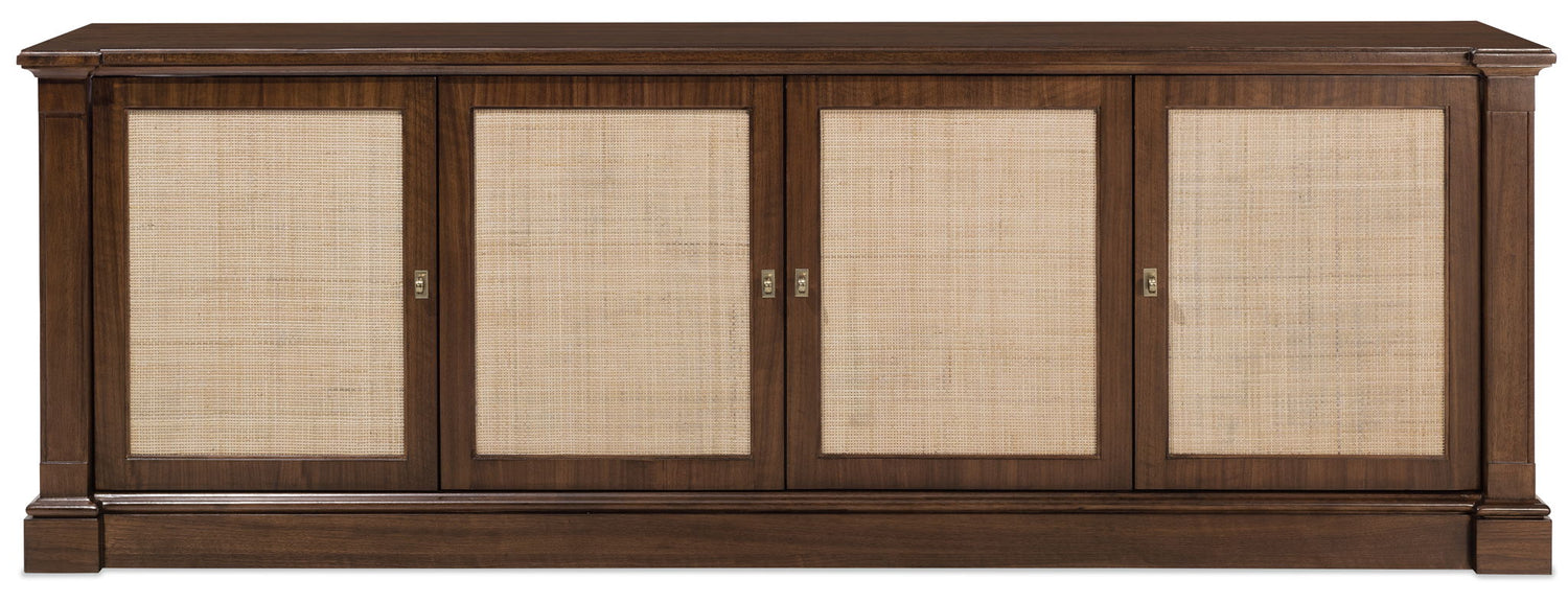 The Archives Entertainment Console brings a sophisticated blend of materials and finishes to your home entertainment space. Featuring four woven-cane panel doors and adjustable shelving, this console is designed to accommodate an 80" flat-screen TV, offering style and functionality. The high-clarity Classic Walnut finish over walnut veneers adds warmth and richness, while the ventilated back panel ensures your electronics stay cool. Ideal for those seeking a luxurious, yet practical piece to enhance their living room.