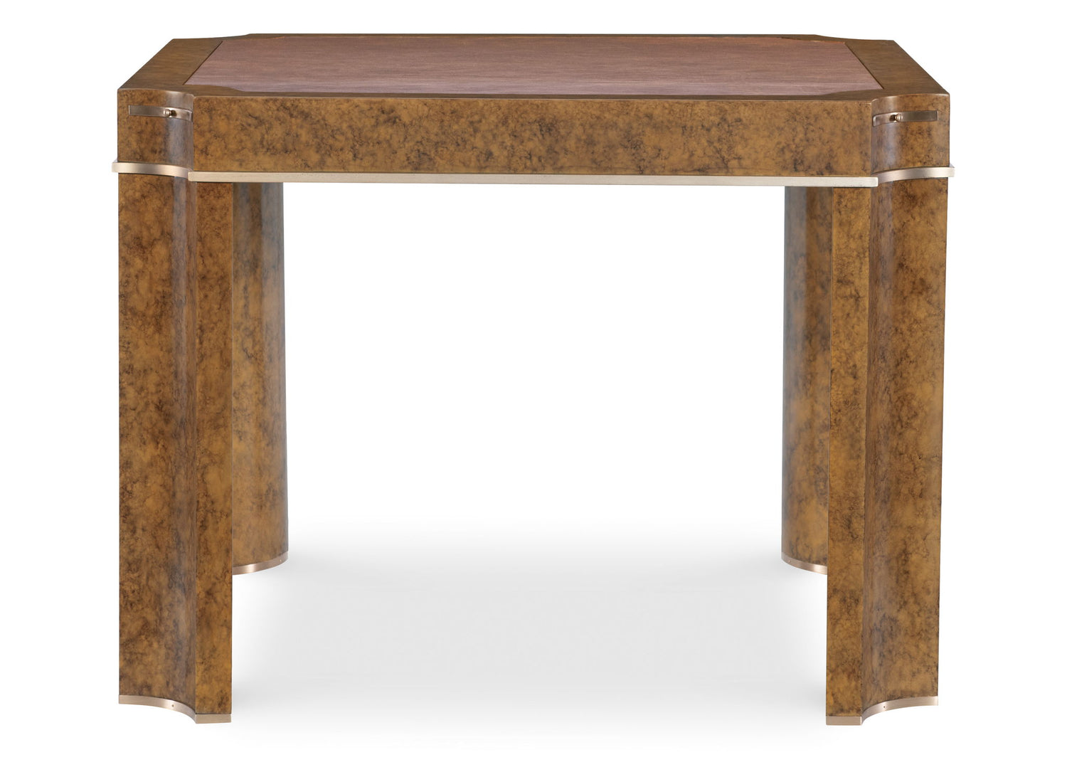 - Brass metal accents around leg bases and apron