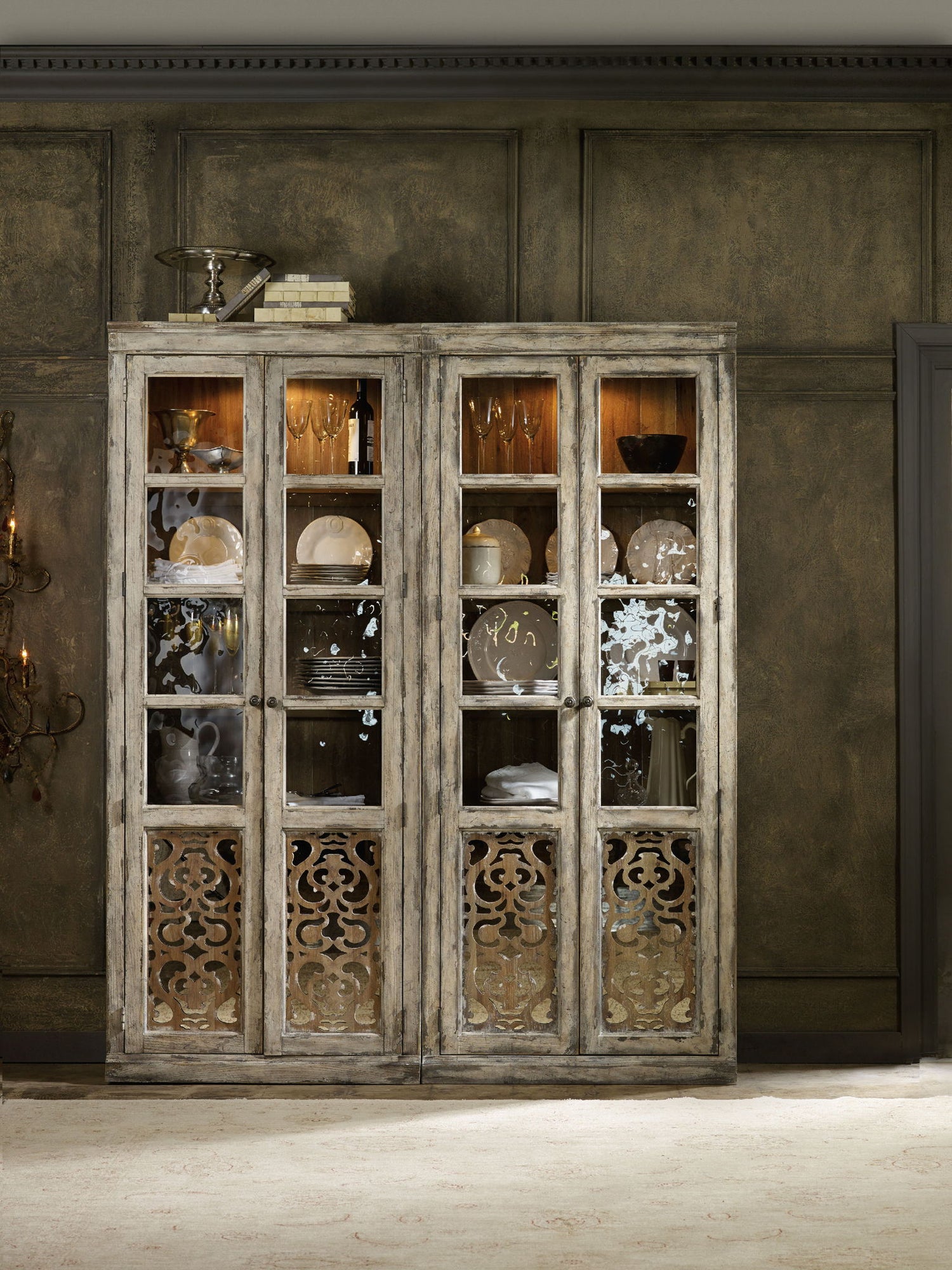 - Two seeded glass doors with mirrored fretwork at the bottom