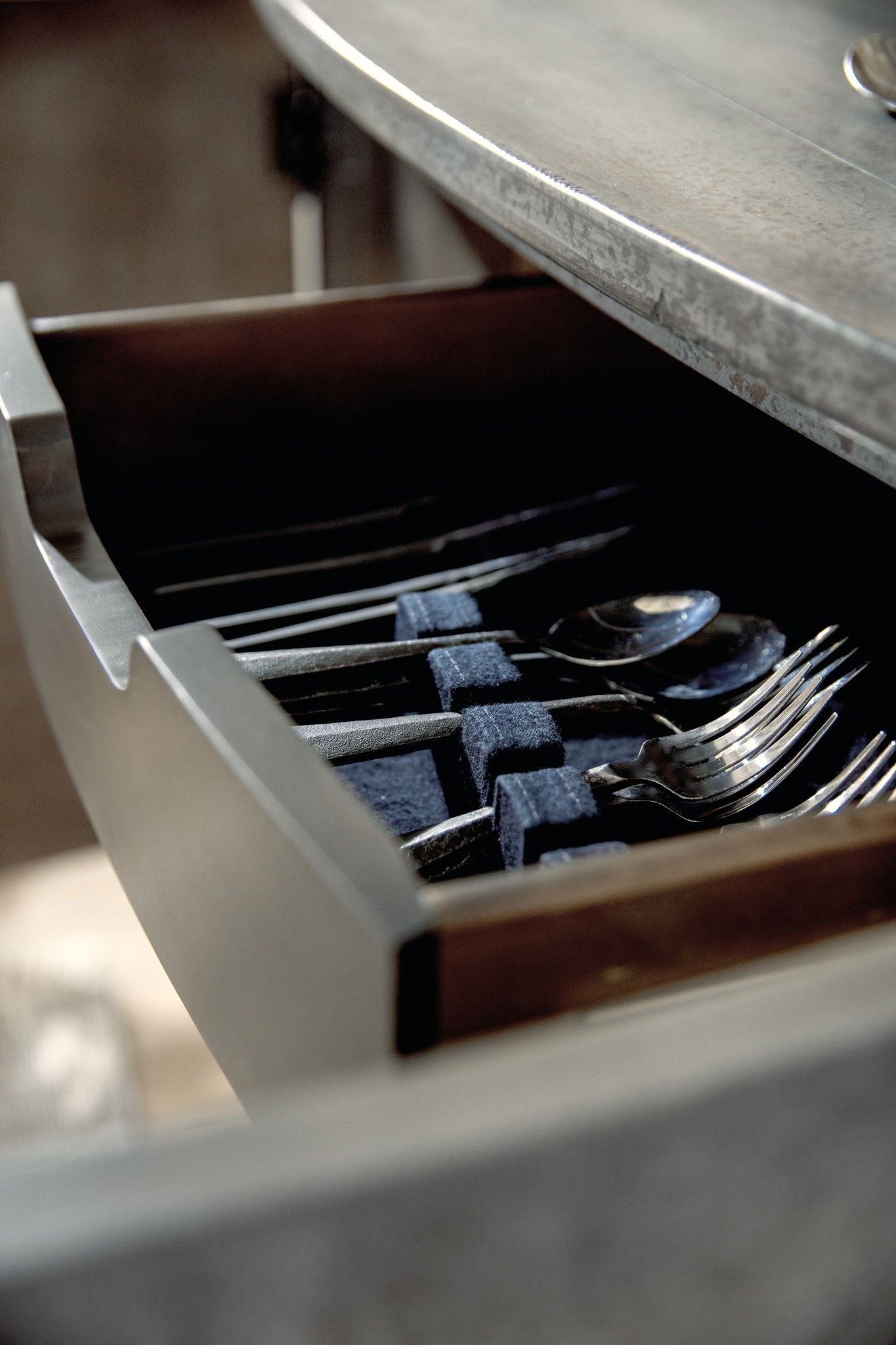 - Drawer have cut-out hand pulls, drop-in felt liners and one with silverware storage