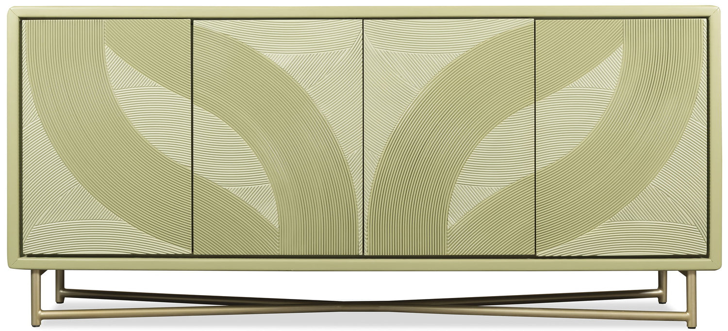 Four touch-latch doors with a carved leafy motif conceal adjustable storage behind this green credenza, grounded by a gold metal base.