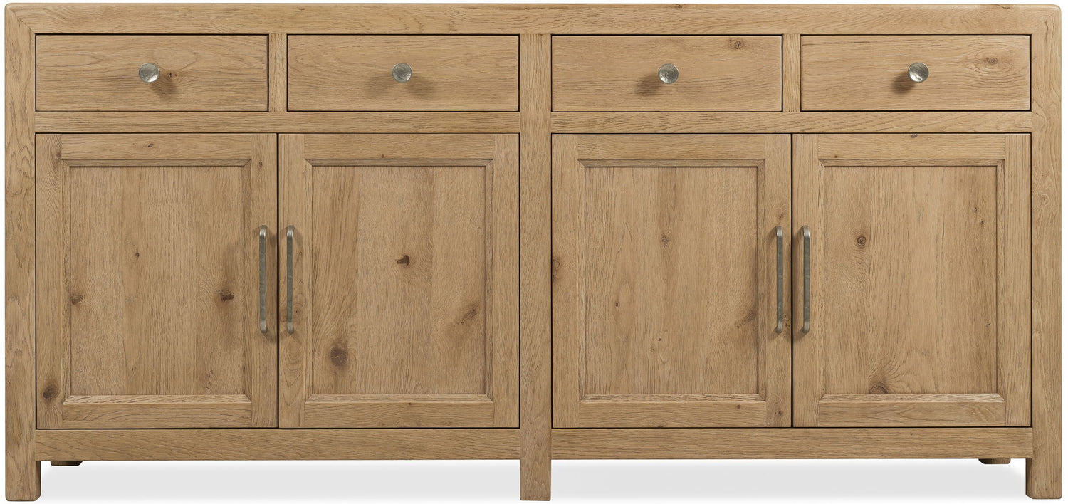 The Driftwood Buffet combines a burnished depth with refined functionality. The inset stone top offers a tactile counterpoint to the oak solids and veneers, while four self-closing drawers and soft-close wood doors keep storage organized and quiet. A removable silverware tray and adjustable shelves make this buffet as practical as it is stylish.