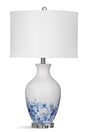 The Sirius Table Lamp is crafted of ceramic in a white and blue finish in a bubble reactive glaze with a white linen drum shade and silver accents. The hand crafted details are produced by a skilled artist, lending itself to a unique technique and which may feature slight variations between each piece. The white linen lamp shade measures 15x15x10.