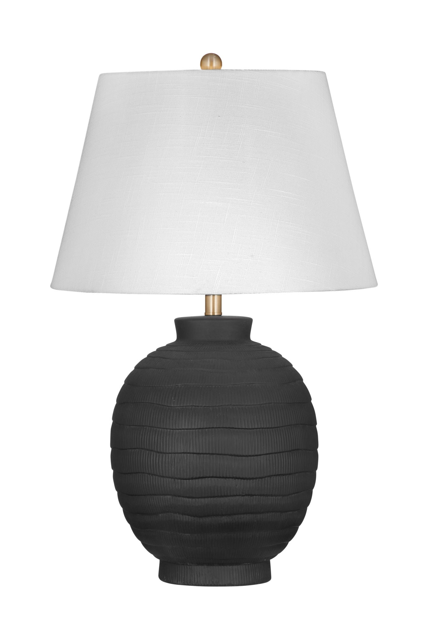 - This black table lamp features a Modern style.