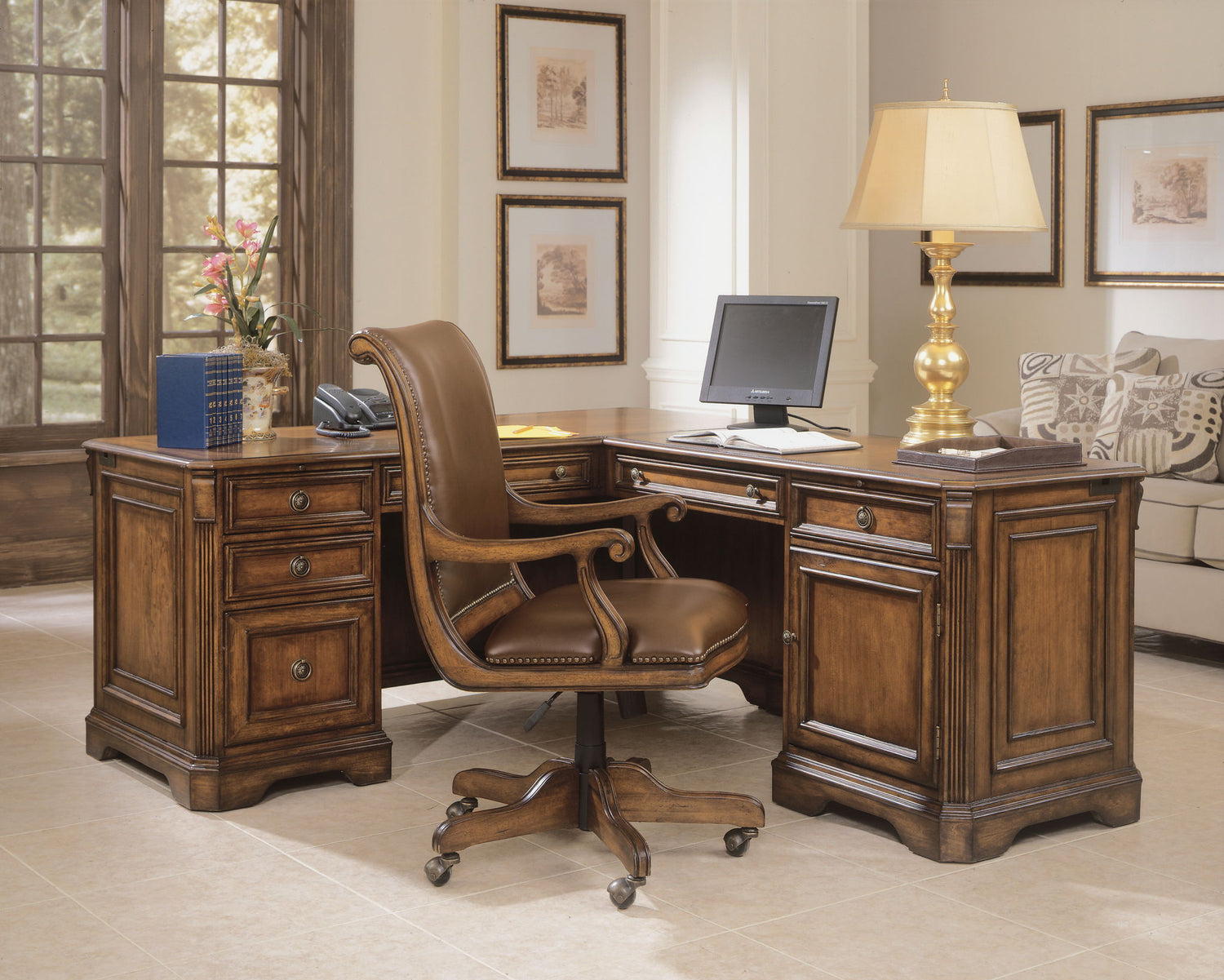 - Left Pedestal Desk: Three drawers on steel ball bearing slides include two utility drawers, partitioned storage tray in top utility drawer, three sections in second utility drawer, one file drawer with Pendaflex hanging file system and center drawer with drop-front for use with a computer, pullout writing shelf, pedestal lock, wire access grommets, levelers