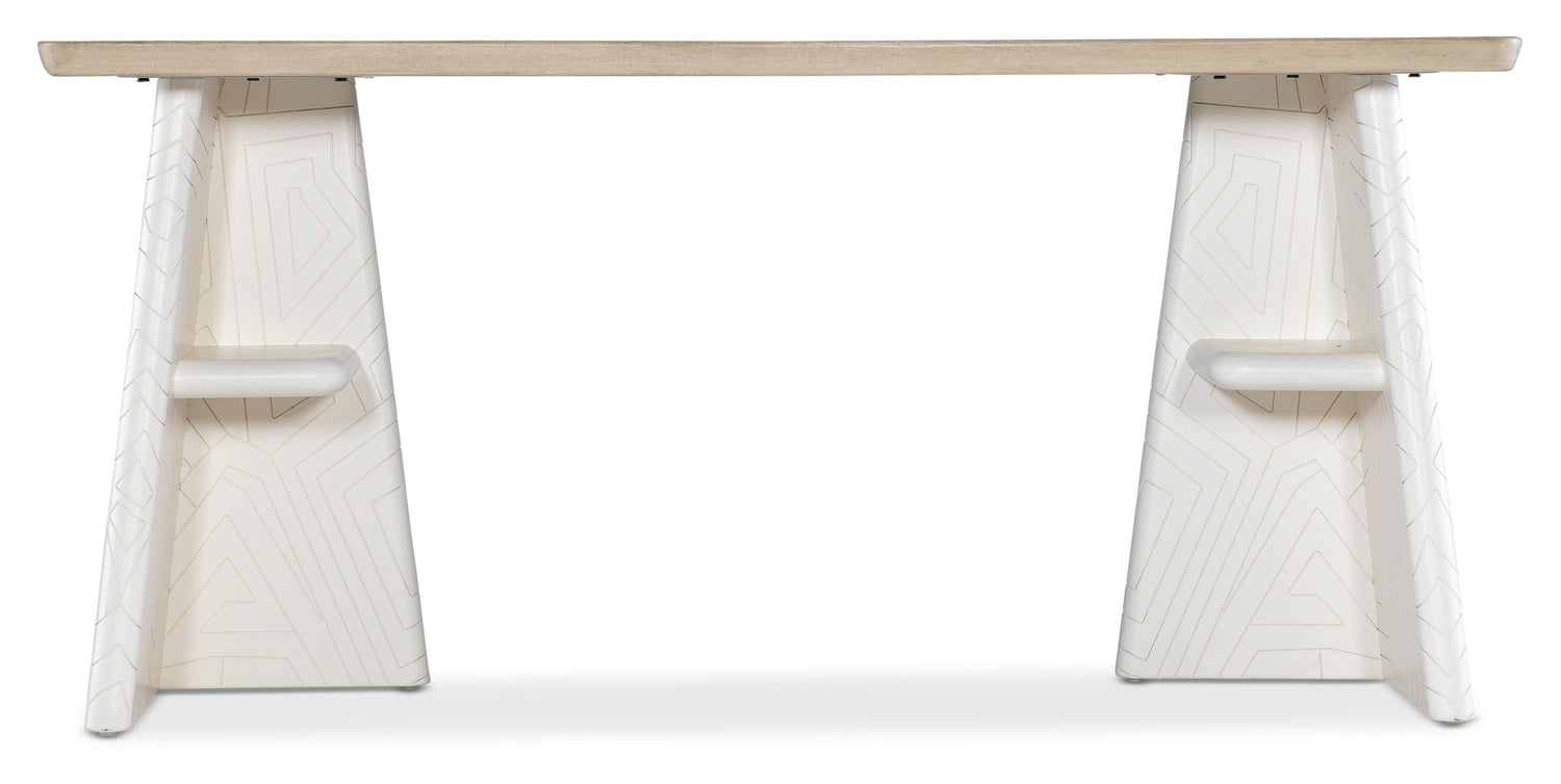 - Two-tone finish with creamy white base with geometric design and contrasting light elm finish on top