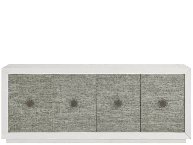 The Seascape Credenza combines a Shoreline white case with textured grasscloth door fronts and distinctive antique nickel hardware. This 85-inch credenza with 34-inch height, felt-lined silverware tray, and interior shelving with wire management creates perfect dining storage with rich textural interest.