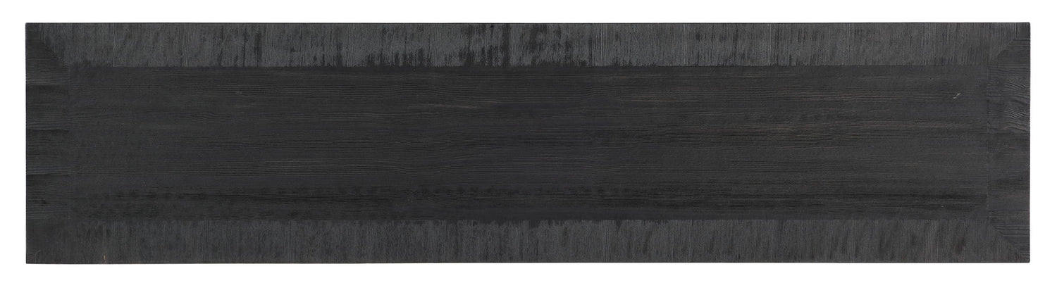 With a Moroccan flair and an elegant black and silver color scheme, the Madeline Credenza is crafted of Pine Veneers with a black wood finish, textured metal hexagonal knobs and silver floral motif accents. With four doors, there are two drawers behind each pair of center doors, two adjustable shelves behind each outside door and one fixed shelf above the drawer in the center section. Ventilated back panel with hand holes.