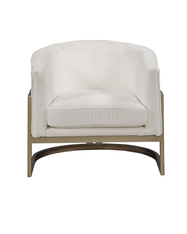 - This barrel chair features a hand-brushed gold wrap-around metal frame