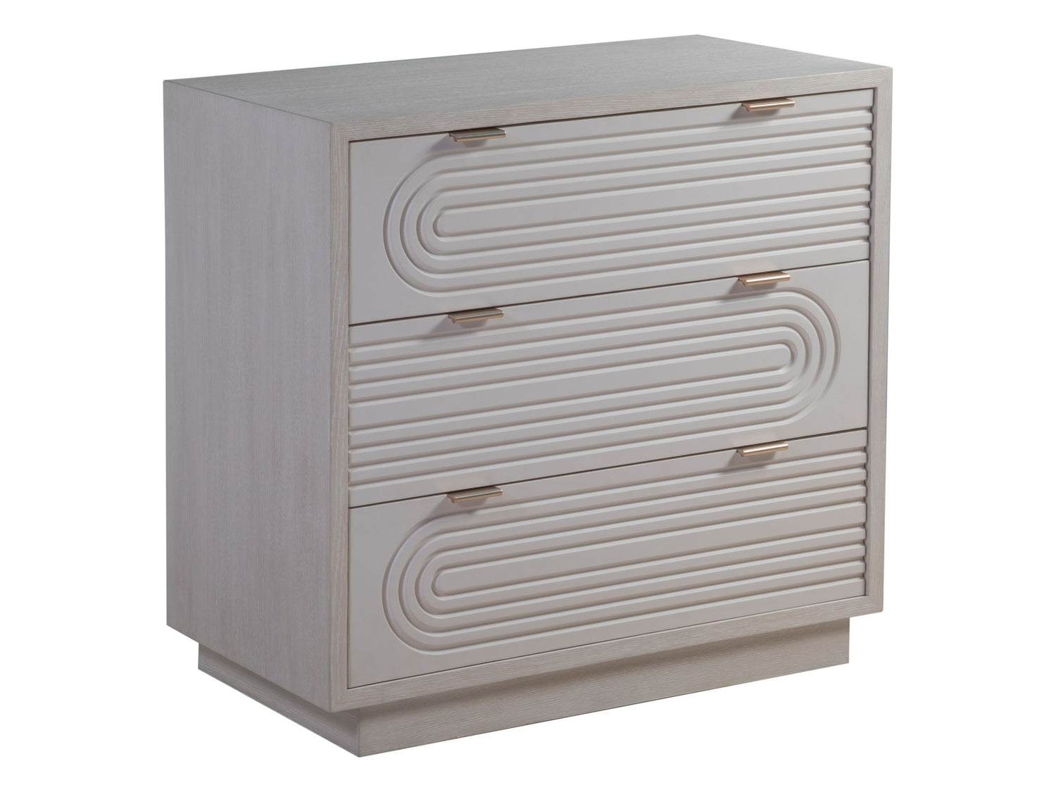 - Simple, Transitional Silhouette Marked By A Whimsicial—some Might Say Groovy—carved Pattern In The Three Drawer Fronts Straight Out Of The 1970’s In A Matte Ivory Paint Complementing The Case Finish