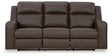 Indulge your lust for comfort and love for contemporary design with this reclining sofa. Made for easy everyday living, it’s upholstered in a heavyweight padded faux leather and accented with contrast jumbo stitching for fashion-forward flair. Sleek track arms elevate the look with a touch of modern sensibility. A drop-down table with dual cup holders and USB charging completes the experience.