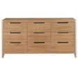 The Walker Drawer Dresser boasts nine drawers and is finished in an organic Natural Oak, offering a versatile and dynamic piece that's as functional as it is aesthetically pleasing. Its natural finish highlights the inherent beauty of the wood, making this dresser a timeless addition to any bedroom seeking a blend of practicality and natural elegance.