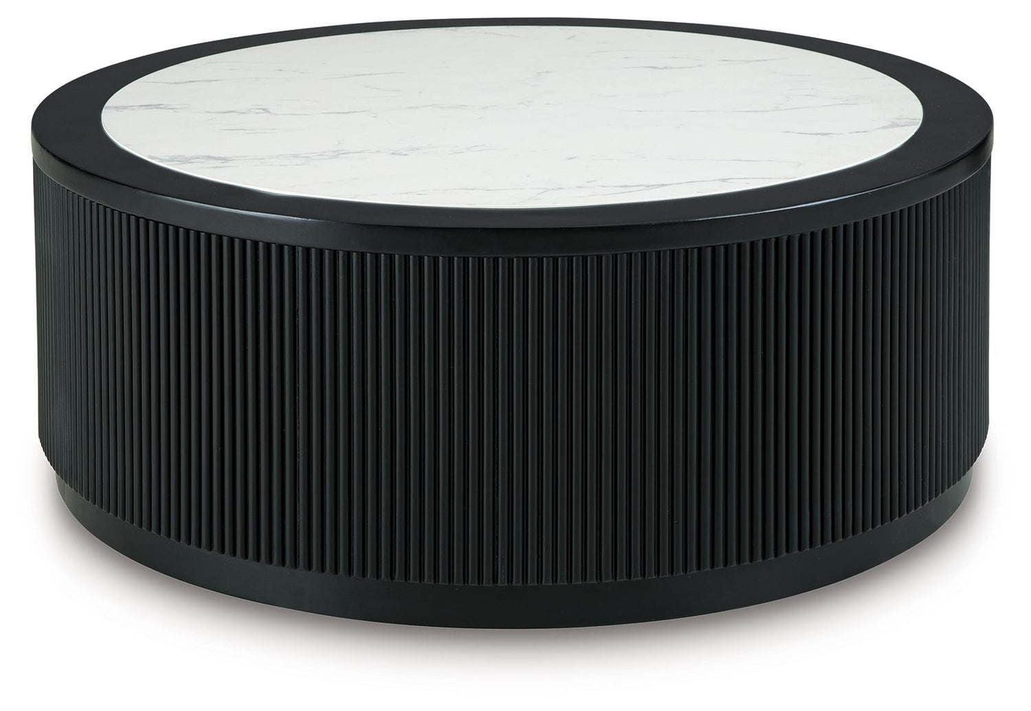 Elevate your living space with sleek sophistication. Sporting a bold drum silhouette in a matte finish, this table is topped with faux Carrara marble for a high-end look without the high maintenance. Trend-right reeded details add texture and visual interest. Subtle casters make the table easy to move when you need extra space, adding flexibility without sacrificing style.