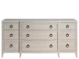 - Nine Drawers; Two removeable Gray felt lined jewelry trays in top center drawer; White Oak finish