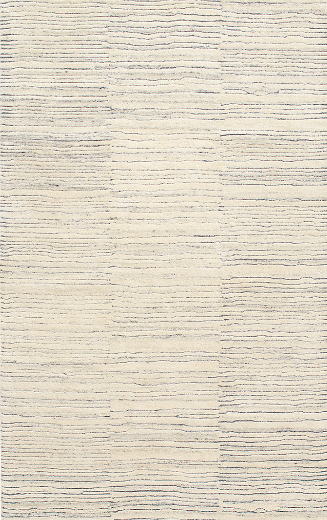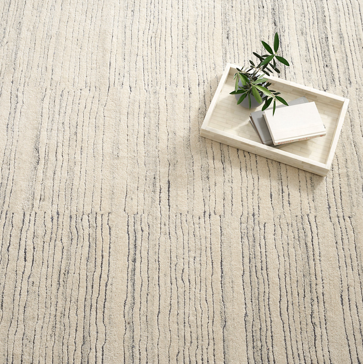 Inspired by substrate layers of sandstone sediments that chronicle the millennia, this luxurious, irregularly striped wool rug will stand the test of time. The subtle degradations of a natural undyed fleece pile enhance the finely observed irregular striping in a softly mineral palette. The subtle beauty of the higher sheared tufts emphasizes the contrast of the densely looped stripes.