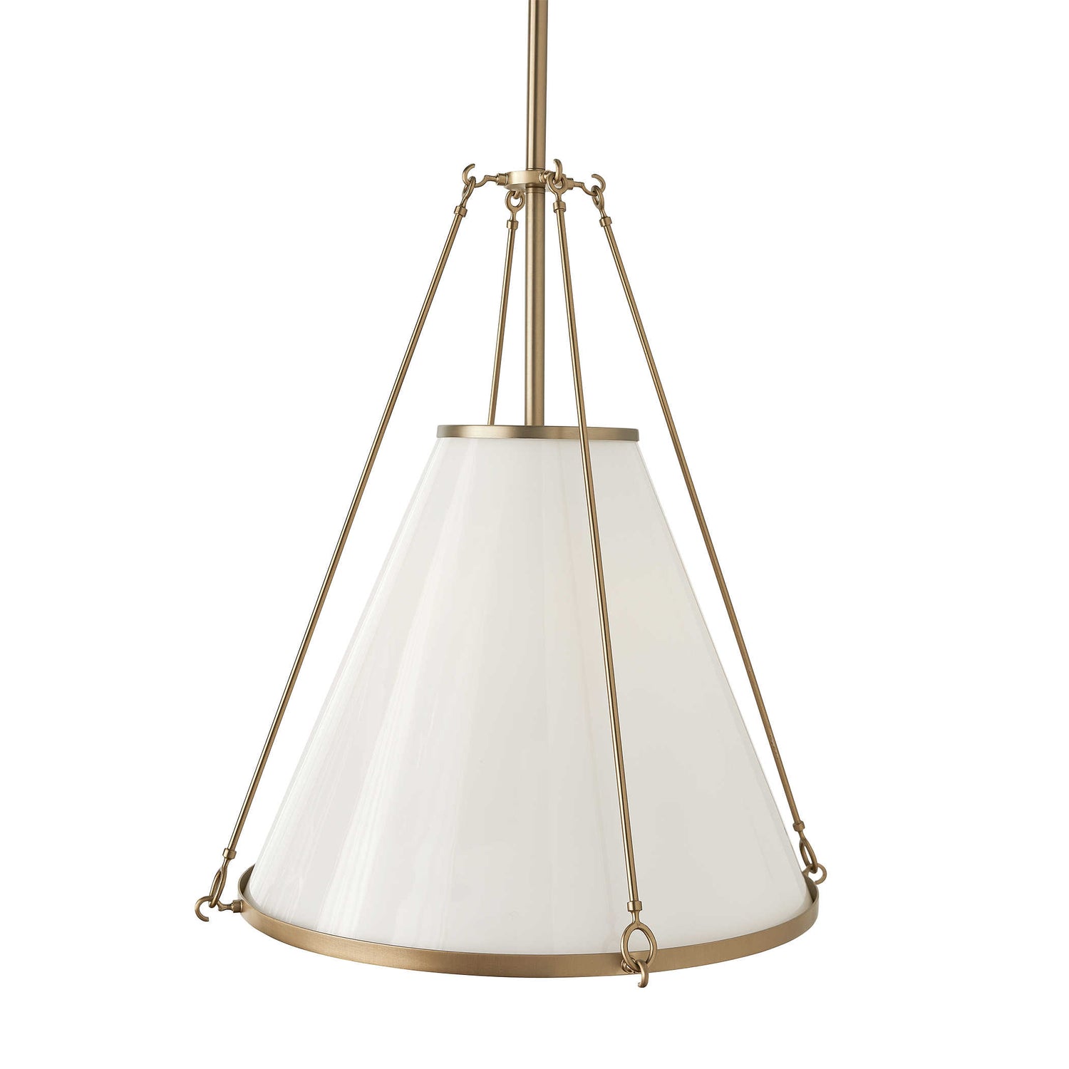Inspired by French bistro lights used in the early 20th century. The hook-and-rod suspension brings charm to this classic one-light pendant. Finished in rich brass with an oversized opal glass shade. Includes 1-150 watt max Edison socket. Supplied with 15' wire, 3-12" stems and 1-6" stem for adjustable installation.