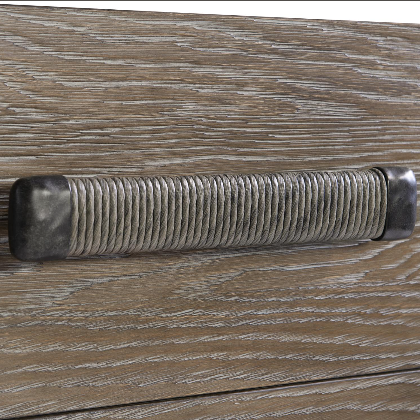 The Casa Paros nightstand showcases a balance of materials with a serene organic design. The Bedrock faux concrete finish on the two support panel legs offers the look of stone. Two soft-close drawers in the Playa wood finish are balanced above a support shelf. Cast metal hardware is wrapped in twisted rope for a unique texture. And a two-port USB charging unit is featured on the back of the case.