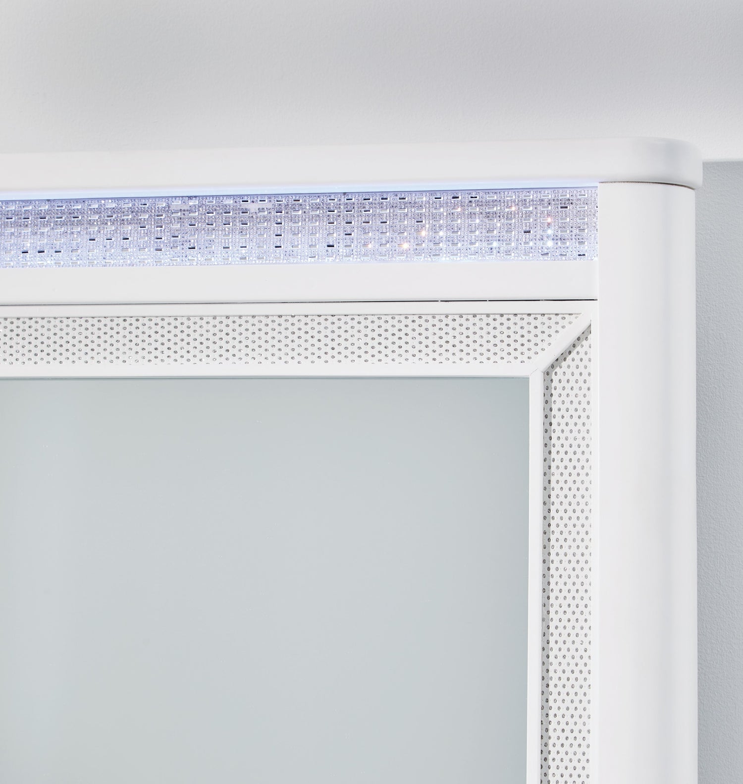 - Drawers with rhinestone frames; textured laminate drawer fronts