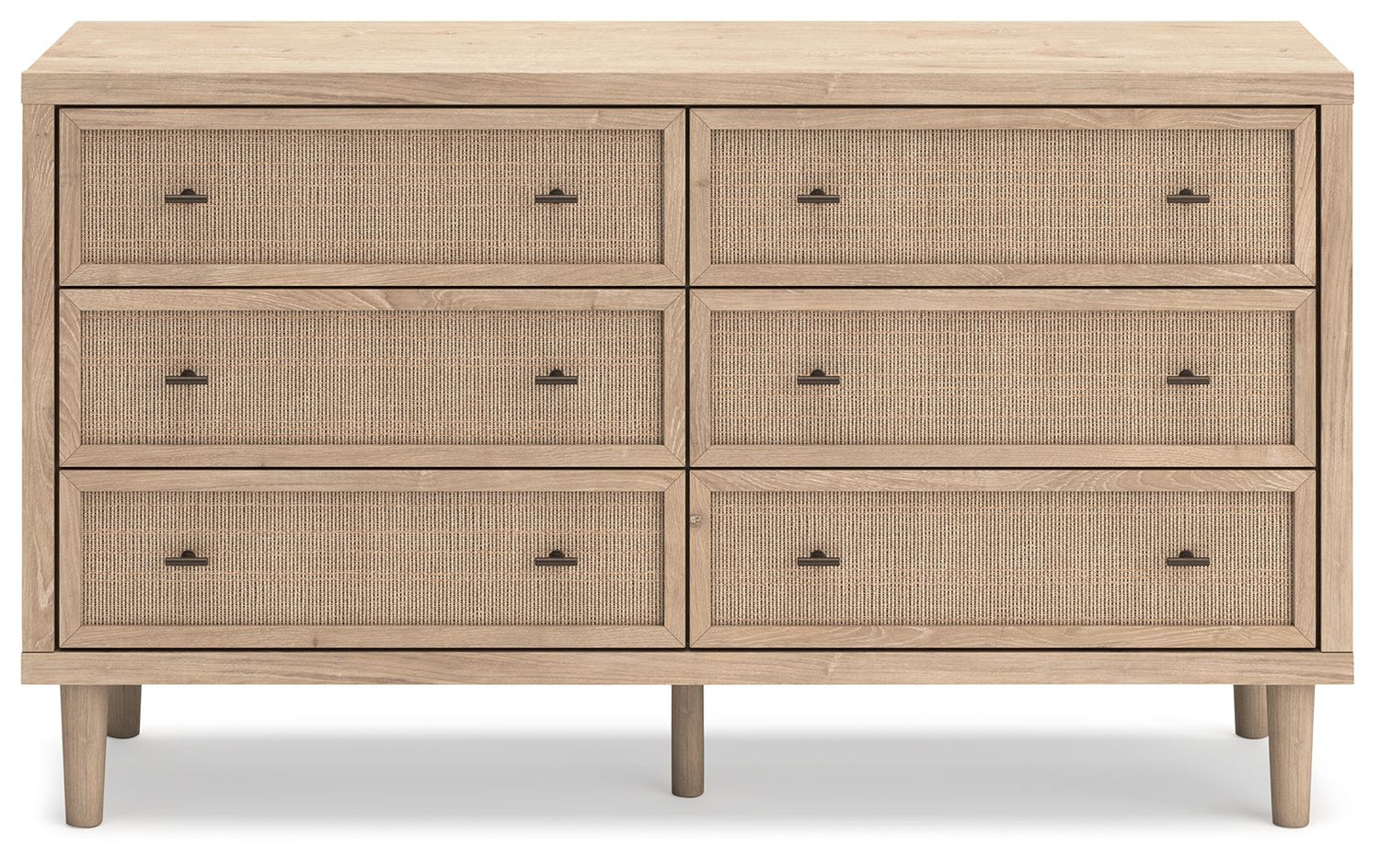 - Framed drawer fronts with textured beige finish that replicates the look of cane