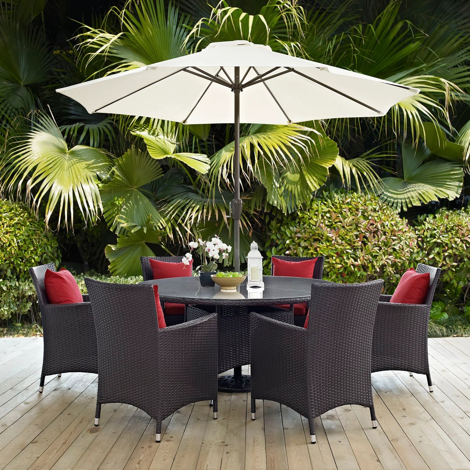 Gather stages of sensitivity with the Convene Outdoor Sectional series. Made with a synthetic rattan weave and a powder-coated aluminum frame, Convene is a versatile outdoor collection that shifts and combines according to the spontaneous needs of the moment. Outfitted with all-weather fabric cushions, leave a positive impression on friends and family while enhancing your patio, backyard, or poolside repast in this series of palpable distinction. This installment of the series is an Outdoor Patio Dining Table and Umbrella Set.