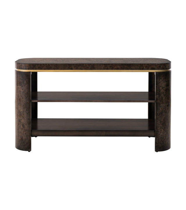 - Constructed from solid wood and select mappa burl veneers with a rich ebonized finish