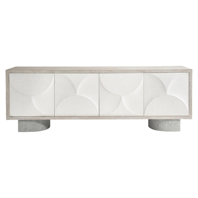 Boldly dramatic design is brought to life in the Lunula entertainment credenza. Cast resin creates a textural surface with dimensional forms that captivate and engage. A wood frame in a Flaxen finish embraces the exuberant look, while cast and chiseled concrete bases support the elemental vision. Four soft-close doors open to showcase ample storage.