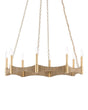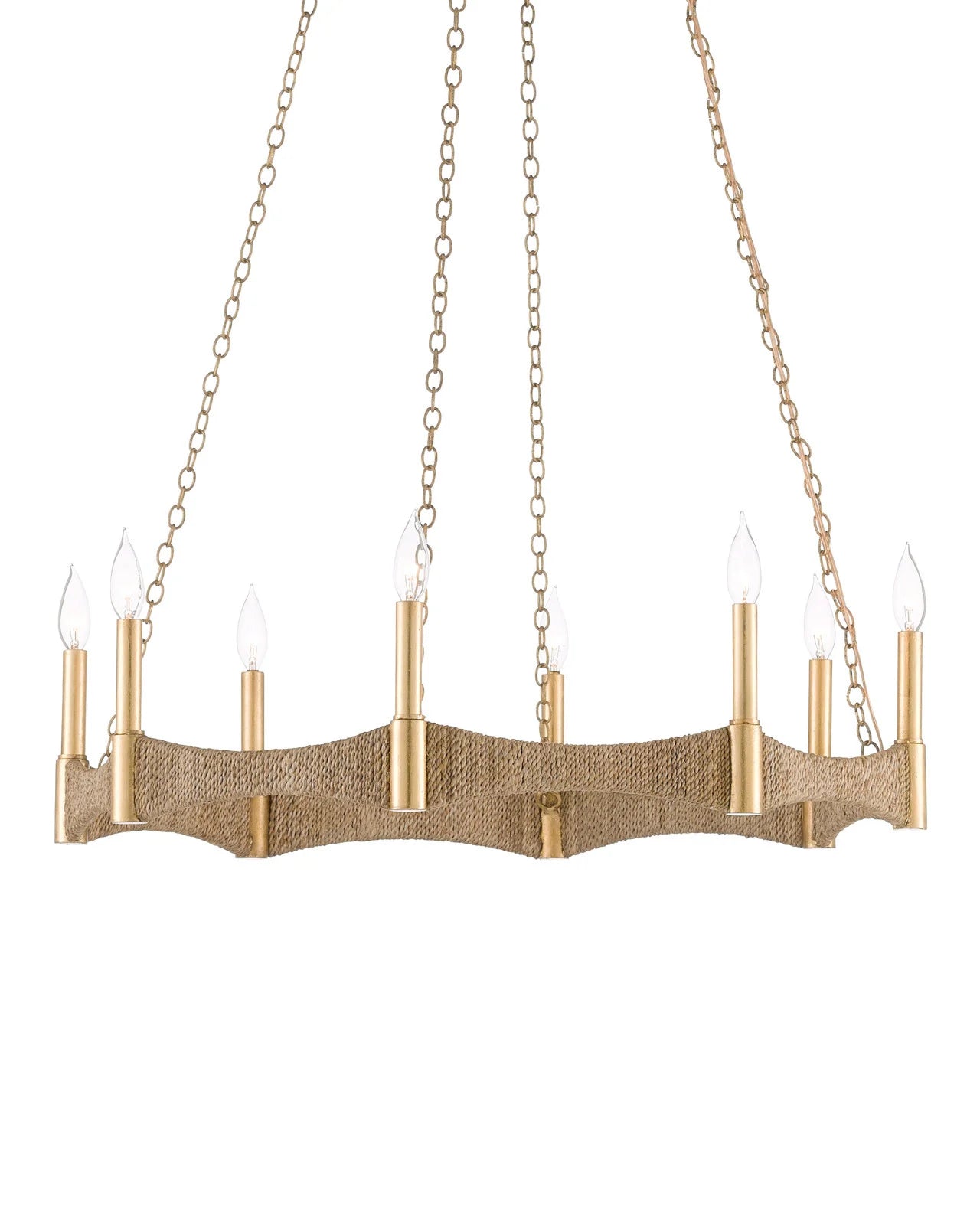Our Mallorca Chandelier has a wavy profile. The band that connects the eight lights is made of wrought iron wrapped in Abaca rope. The bulbs that illuminate this rope chandelier are set on luminous rods in a dark contemporary gold finish.