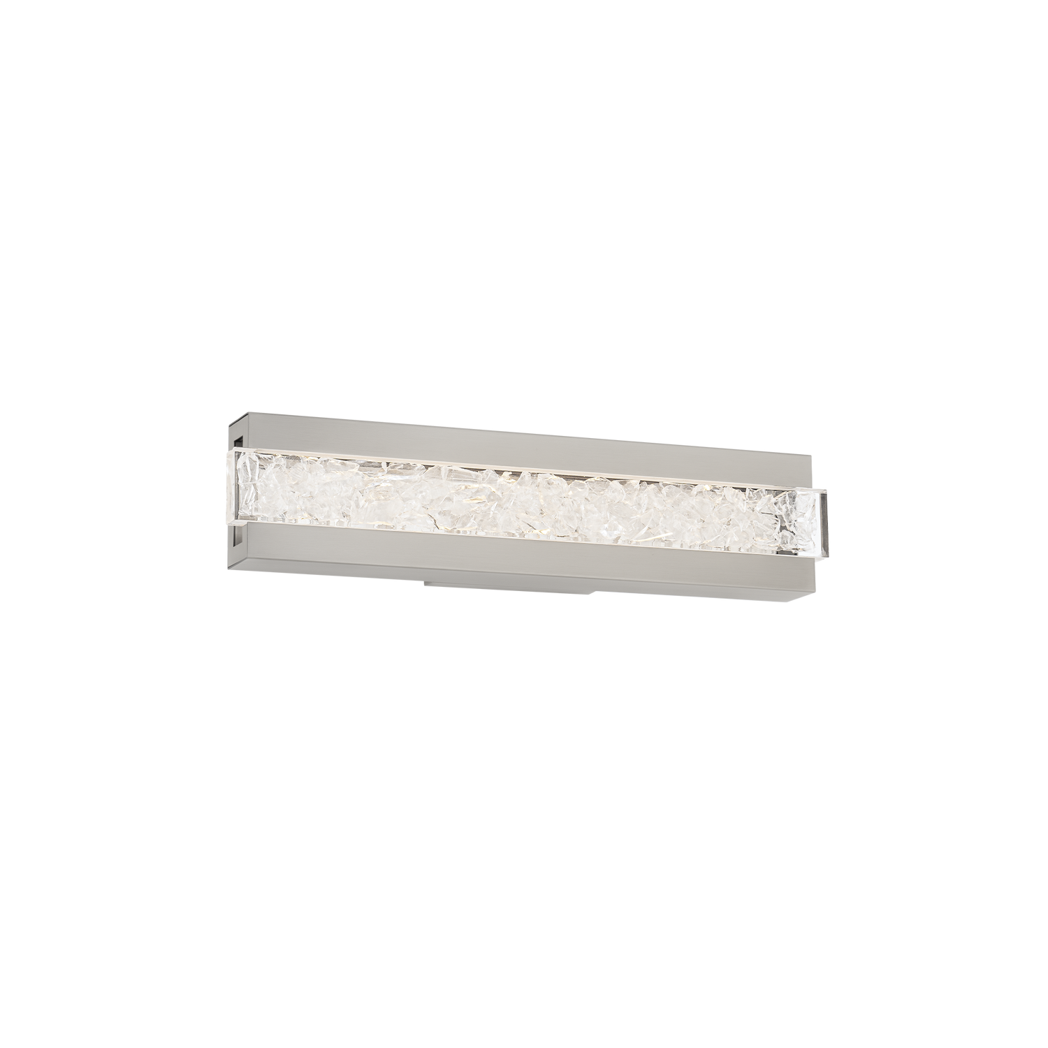Radiant, textural, elegant. LED illumination refracts through a sparkling reclaimed K5 crystal diffuser bound on either side by gleaming metallic bars.