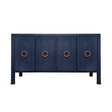 Four door cabinet with antique brass circle hardware in textured navy linen.