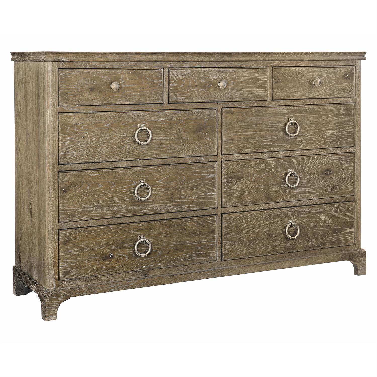 The Rustic Patina collection gives a modern facelift to traditional designs with roots in English and French country furniture, incorporating rustic touches to create a casual look. This nine-drawer dresser built from imperfectly perfect white oak and adorned with antiqued metal pulls embraces tradition while retaining a level of elegant sophistication. Create a bedroom that is cozy and big in comfort with this heirloom-quality piece. Available in two finishes: Sand and Peppercorn.