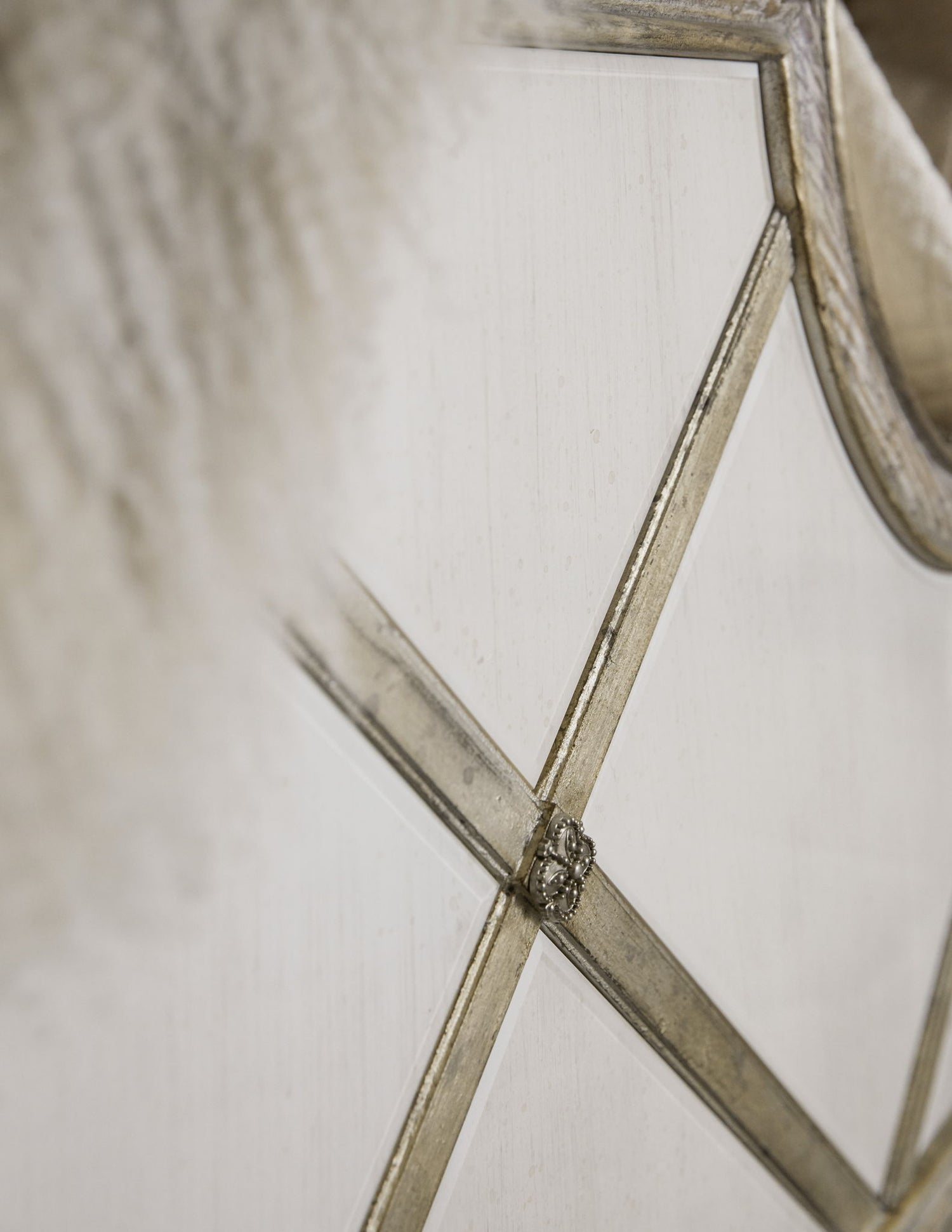 - Finish Description: The main finish is Le Sable, a light wood tone washed with a white and gray glaze. Distressing includes rasping, gouging and worm holes. The diamond fretwork is Jewel, a silver finish with rich undertones of gold and champagne. Headboard and footboard panels use Merinque, a reverse painted glass in a creamy white finish.